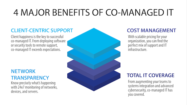 Co-managed IT with a Managed Service Provider (MSP) offers businesses the best of both worlds, retaining in-house IT knowledge while gaining access to a broader team of experts. This partnership allows internal staff to offload routine tasks such as monitoring, patching, and help desk support, freeing them to focus on strategic initiatives. At the same time, the MSP brings advanced tools, 24/7 coverage, cybersecurity expertise, and scalability that most small and mid-sized businesses cannot achieve on their own. The result is a stronger, more resilient IT environment, cost savings compared to hiring additional full-time staff, and the assurance that your technology is always aligned with industry best practices.